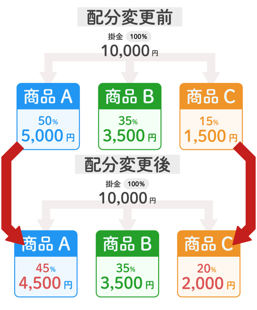 配分変更とは、これから拠出される掛金をどの商品にどの割合で投資するかを変更することです。新たに商品ラインアップが追加された場合などにも変更できます。なお、配分変更はあくまで今後の掛金に適用され、すでに運用中の資産には影響しません。