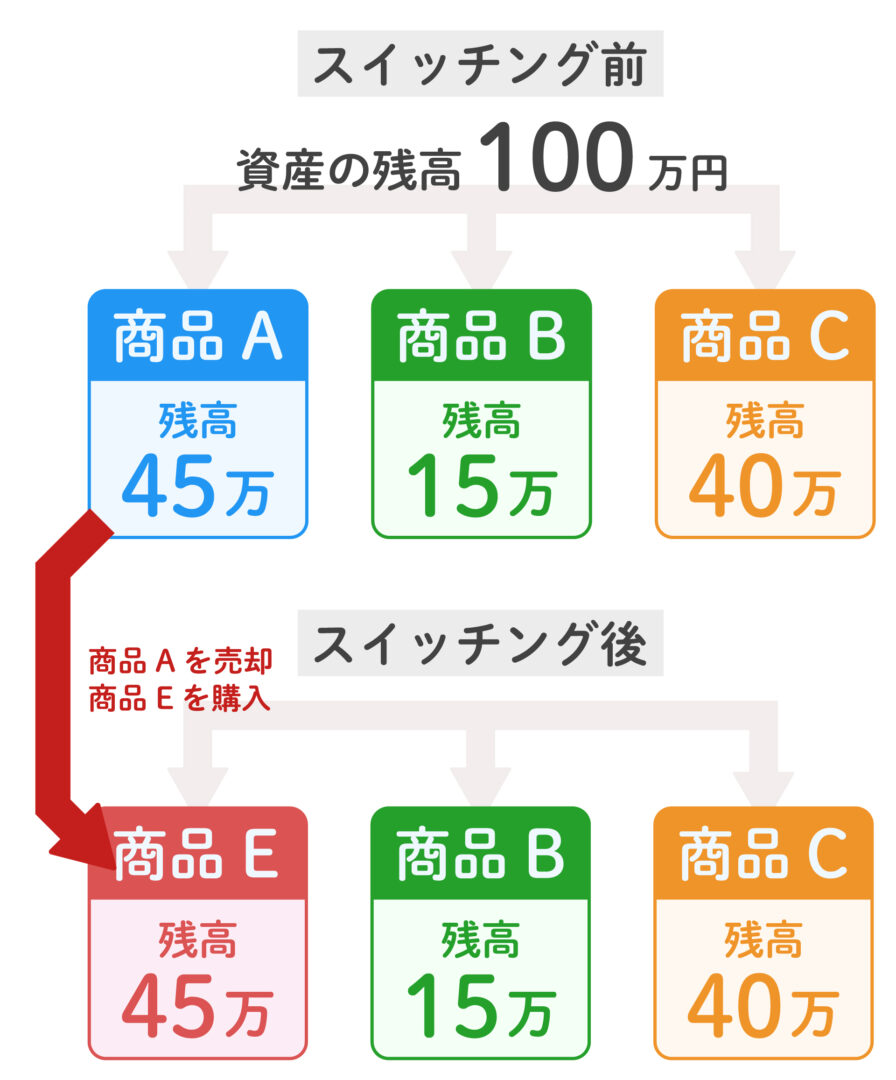 スイッチングは、すでに運用されている資産の運用商品を売却もしくは解約し、その資金で別の商品に買い替えることを指します。つまり、現在運用されている資産を別の運用商品に移す操作です。